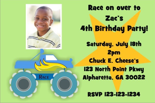Monster Truck Photo Invitation 2. Your little boy will love to have this birthday party invitation. It features an illustrated monster truck and you can also add a photo. Choose the background color and personalize it with your wording. Order today. - Reviews